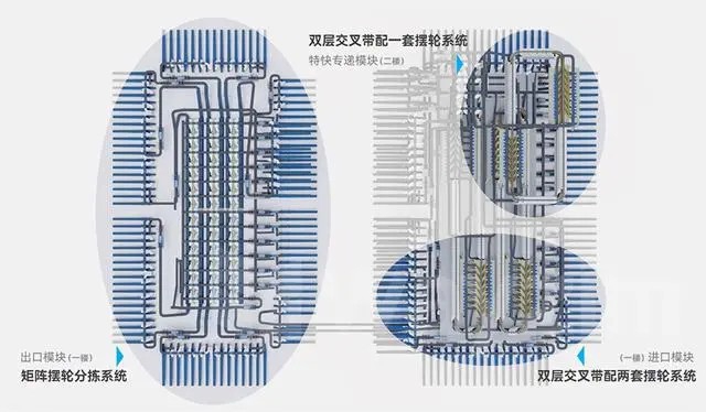 配置一套雙層小件分揀機(jī)系統(tǒng)用于特快專(zhuān)遞小件和文件處理,配置一套矩陣擺輪分揀系統(tǒng)用于特快專(zhuān)遞大件、總包郵件的處理和傳輸。