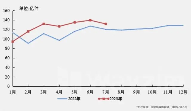 國(guó)家郵政局監(jiān)測(cè)數(shù)據(jù)顯示,2023年1月~7月,郵政行業(yè)寄遞業(yè)務(wù)量累計(jì)完成873.7億件,同比增長(zhǎng)12.8%。其中,快遞業(yè)務(wù)量(不包含郵政集團(tuán)包裹業(yè)務(wù))累計(jì)完成703.0億件,同比增長(zhǎng)15.5%。2023年郵政行業(yè)寄遞業(yè)務(wù)量較2022年顯著提升。